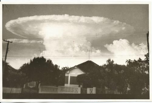 O cogumelo formado aos fundos dá realmente essa impressão. Na verdade era apenas uma curiosa formação de nuvens na década de 60 fotografada na avenida Manoel Ribas defronte à residência da Sra. Edith Setti Trevisan. A casa existe até hoje e já foi objeto de publicação neste fotoblog.