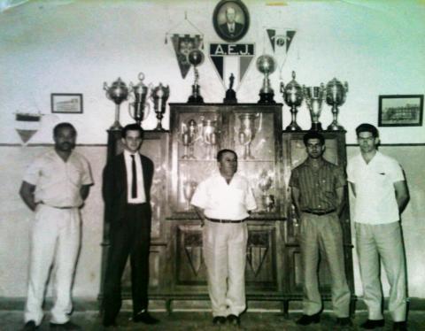 Imagem dos anos 60 mostra o grande presidente da Associação Esportiva de Jacarezinho Jofre Elias posando com membros de sua diretoria vendo-se nos fundos parte da coleção de troféus que a equipe conquistara ao longo dos anos. Dentre os diretores eu me encontro à esquerda de terno escuro, época em que eu ocupava a vice-presidência da agremiação.