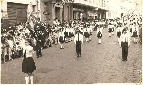 Durante muitos anos funcionou vinculado ao Colégio Estadual Rui Barbosa o Instituto de educação de Jacarezinho. Nesta imagem, possivelmente do final dos anos 6o ou início da década de 70, o Instituto desfila pela rua Paraná sendo interessante observar-se os prédios entõa existentes: o primeiro, é o da antiga agência do Banestado mas a porta que se vê era de entrada da Farmácia São José, que teve vários proprietários, entre eles Feliciano Barros, Hernandes Rocha e César Rigo. Na sequência o prédio da Drogaria Minerva e que hoje, com a fachada totalmente alterada funciona a Farmácia Santa Terezinha. Na sequência o Edifício Consórcio (hoje, Homero Cordeiro).