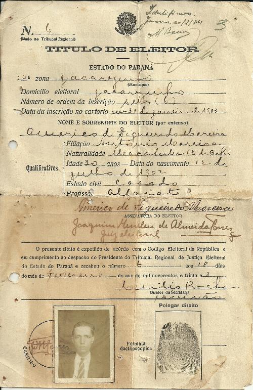 Emitido em 18 de fevereiro de 1933 este Título de Eleitor é uma preciosidade uma vez que se trata da pessoa de Américo de Figueiredo Moreira cujo nome ocupa importante espaço na história de Jacarezinho. Como profissão era um excelente alfaiate com seu estabelecimento comercial na rua Coronel Batista. Como chefe de família foi uma pessoa exemplar. E como cidadão ocupou por várias vezes um lugar como Vereador de Jacarezinho. Faleceu vítima de acidente deixando um grande legado de trabalho, dedicação e amor pela família, pela profissão e pela comunidade.