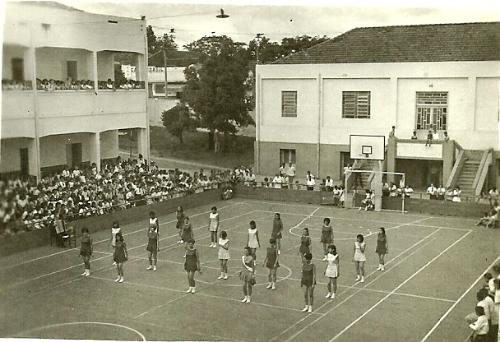 Esta imagem deve ser dos anos 60. Com a quadra tomada por alunos e pessoas da cidade, um grupo se apresenta no Colégio Rui Barbosa parecendo ser uma demonstração de ginástica ritmica. Dentre as meninas que estão na quadra uma delas porta uma faixa que não foi identificada.