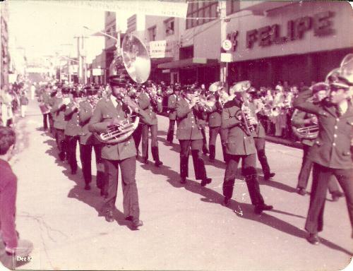 Imagens do 7 de Setembro em Jacarezinho. Esta do ano de 1982 mostra a Banda do 2º Batalhão da Polícia Militar, sediado nesta cidade, cruzando a esquina mais fotografada de Jacarezinho: a Paraná com a Coronel Batista.