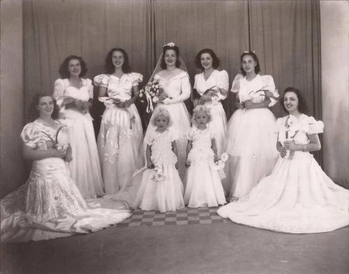 Nos primeiros anos de sua colonIzaiçaõ, Jacarezinho teve inúmeros cidadãos integrantes da então Guarda Nacional que conferia títulos militares a determinadas personalidades. e dentre elas, a história dos coronéis de Jacarezinho sempre foi contada e recontada na cidade. Por isso, qualquer acontecimento principalmente social que envolvesse a vida ou a família deles, ficava marcada para sempre. Esta imagem mostra a filha do Coronel Figueiredo, Elza, momentos antes de seu casamento com Jorge Radeck posando para o fotógrafo, possivelmente Eurico Krois. Encontra-se ela ladeada por Themis Baptista, Fiúta Ivete (Elza, a noiva), Cida, Giselda e Jupira. As meninas gêmeas são Arlete e Janete, nesta do coronel.