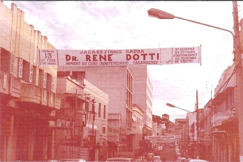 Jacarezinho sempre foi conhecida como "cidade das faixas". Qualquer acontecimento, festa, comemoração etc. é divulgado através de faixas espalhadas pela cidade. O costume começou quando a cidade ficou sem nenhum jornal e este era um meio de comunicação visual bastante útil. Hoje, com jornal e sites o costume ainda continua. Esta foto é de meados dos anos 7o e nela se vê a divulgação da Semana de Estudos Penitenciários que a Faculdade de Direito iria promover e dentre os conferencistas estava o consagrado jurista René Dotti. A Rua Paraná, ao que se vê, sofreu várias transformações, principalmente do lado esquerdo.