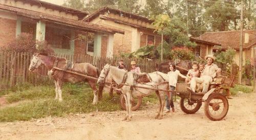 Esta foto registra um momento de tranquilidade na Usina de Jacarezinho, com o Sr. Paulo Rosa rodeado de crianças, parte na charrete que ele conduzia, parte em outra. As crianças são, da esquerda para a direita, Luciano Nogari, Carliro, Viviane Nogari, Marquito, Silvio Rosa e Paulo Rosa.