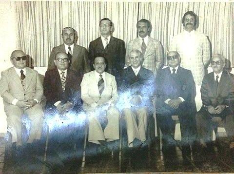 Compõem a diretoria, em pé, da esquerda para a direita: ???. José Corassa. João Amaral e Reynaldo Pelegrini. Sentados: Arlindo Bessa Júnior, ???, o Presidente da entidade Antenor Rocha, Silvestre Marques, ???, e Quincaju.