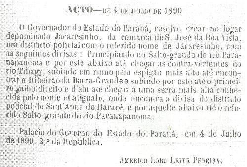 Nesta página é reproduzido o “Acto” que criou o Districto Policial de Jacaresinho, datado de 4 de julho de 1890 e que por se constituir no mais antigo documento de Jacarezinho é que pode ser considerado como sua “certidão de nascimento”.