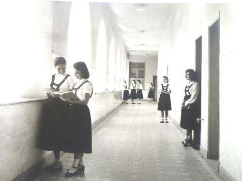 Em foto do final da década de 50 ou início dos anos 60, alunas do Colégio Imaculada Conceição passam os minutos de recreio nos corredores do novo prédio recém construído.