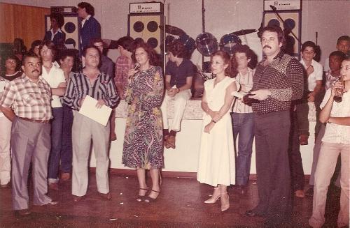 Nesta imagem, do final dos anos 80, o homenageado foi Luiz Rui Rossito, professor querido e respeitado mas também funcionário da empresa Gentil Veículos. Ele s encontra à direita na foto enquanto usa da palavra a representante do SESC na época, Maria Tereza Alves Ferreira (Zoca).