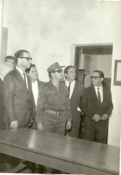 Na oportunidade ele visitou também as dependências do Tiro de Guerra, localizadas em sede provisória onde anteriormente fora a Cadeia e mais tarde a Biblioteca Municipal. Nesta imagem ele está acompanhado do Vereador Silvestre Marques, do Sargento Instrutor do TG, Oly Flores Guimarães, do Diretor do Tiro de Guerra, médico Antônio Garbelini e do Deputado Estadual, médico Haroldo Bianchi.