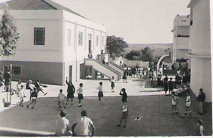 Alunos brincando passam aquele curto momento sempre se confraternizando. No prédio à esquerda o salão onde realizavam-se festas e jogos de salão. Embaixo, era a cantina.