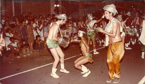 Esta imagem é de um dos carnavais daquele ano, em desfile pela Rua Paraná com a população assistindo entusiasmada.