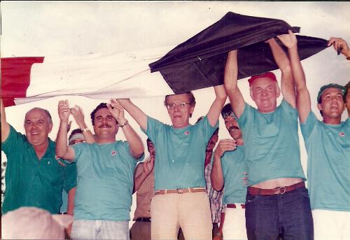 No palanque nesta foto, da esquerda oara a direita, Newton Vilela (fal.), Luiz Antônio Setti (Dep. Estadual), o Prefeito eleito (fal.), Ordorval Spiacci (candidato a vereador - fal.). Um pouco atrás, o vice-prefeio eleito, Paulo Diniz.